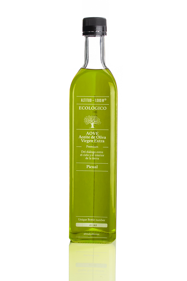Aceite de Oliva Virgen Extra Ecológico Altitud1080 m picual de 500ml edición premium limitada ideal para cocina gourmet. Un producto con un alto nivel en antioxidantes, como son la Coenzima Q10, los tocoferoles y los polifenoles.